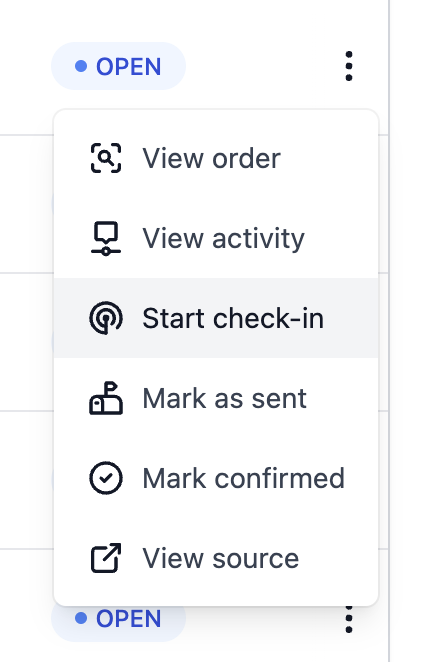 <summary>By clicking "<strong>Start check-in</strong>" from the three-dot menu in a table of orders</summary>