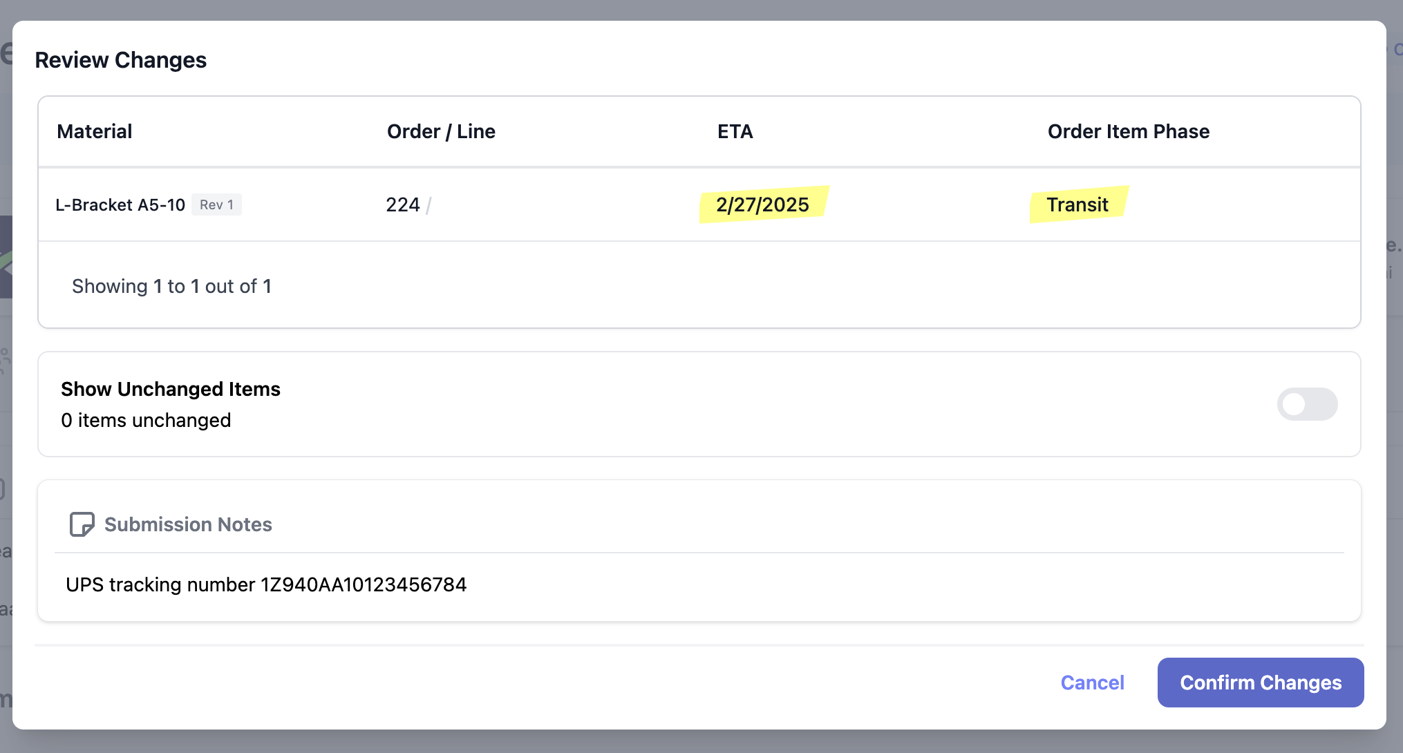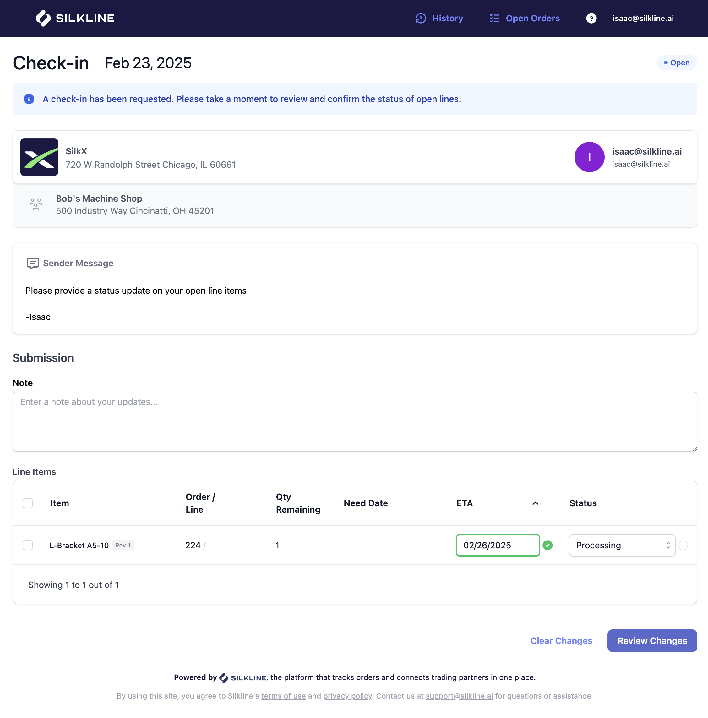 Once satisfied, the supplier submits the check-in by clicking the **Confirm Changes** button. The check-in is closed and locked from edits. Both the buyer and supplier continue to have access to check-ins once they are submitted until the token link expires. After a token link expires, access can be refreshed by sending a new check-in.