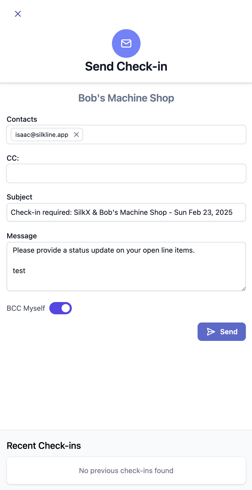 Silkline shows a preview of the last 3 check-ins so you can quickly see the context of prior check-ins before sending a new one.