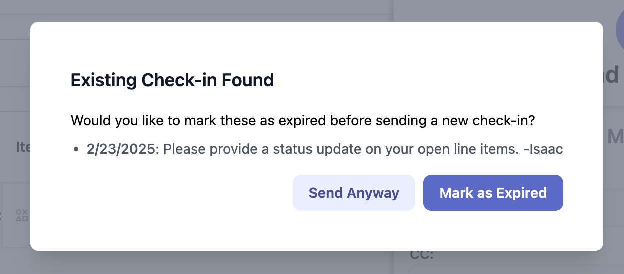 If an existing check-in is open when you try to send a new one, you'll be prompted with a message notifying you of the open check-in. You can select "Send Anyway" to keep the prior check-in open, or you can mark the prior check-in as expired.